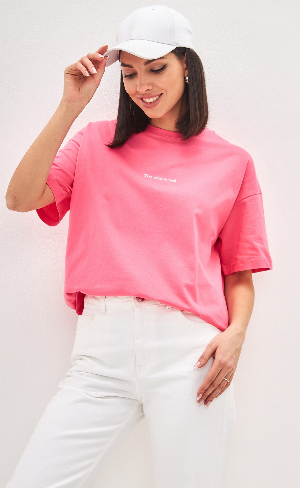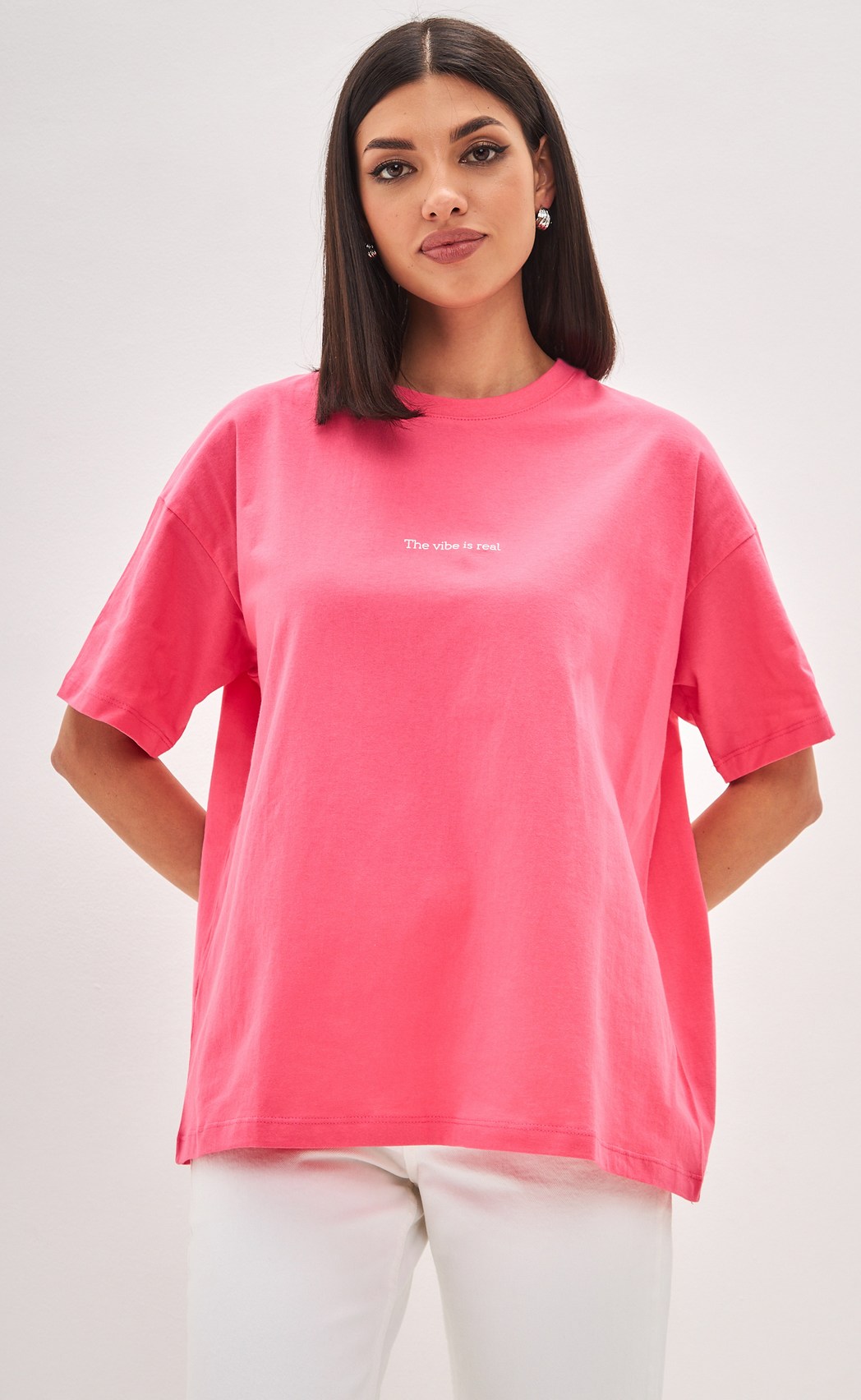 Футболка женская в цвете фуксия и принтом в виде надписи от бренда Fine Joyce. Данная модель свободного кроя, имеет короткий рукав со спущенным плечом и округлую горловину. Свободный крой не стесняет движений, а дышащий материал позволяет чувствовать себя комфортно. Футболка выполнена из натурального высококачественного хлопка. Ткань не просвечивает, не линяет и не скатывается, не подвержена усадке и деформации, сохраняет форму и цвет после множества стирок. Оверсайз футболки оптом выгодно подчеркивают все типы фигур. Они отлично подойдут на летний период, для спорта, йоги, тренажерного зала, пробежек и повседневного использования. Футболки оптом от производителя выполнены в основных базовых цветах, это незаменимая вещь в гардеробе современной женщины. Футболка имеет как стандартную размерную сетку – S, M, L, XL, XXL, так же и большие размеры – 3XL, 4XL, 5XL. Купить женские футболки можно оптом от производителя, зарегистрировавшись на сайте. В карточке товара Вы найдете размерные характеристики, которые помогут Вам определиться с размером. Fine Joyce динамично развивающийся российский бренд. Fine Joyce – высокое качество по оптимальной цене!
